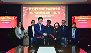 中化国际高性能材料事业部副总经理宋数宾专程前来见证双方签订合作协议。天正设计董事长兼总经理万军、副总经理孔敏、副总工程师赵志明,净源科技执行董事陈昊、总经理吴低潮、董秘蔡可珂等出席签约仪式。